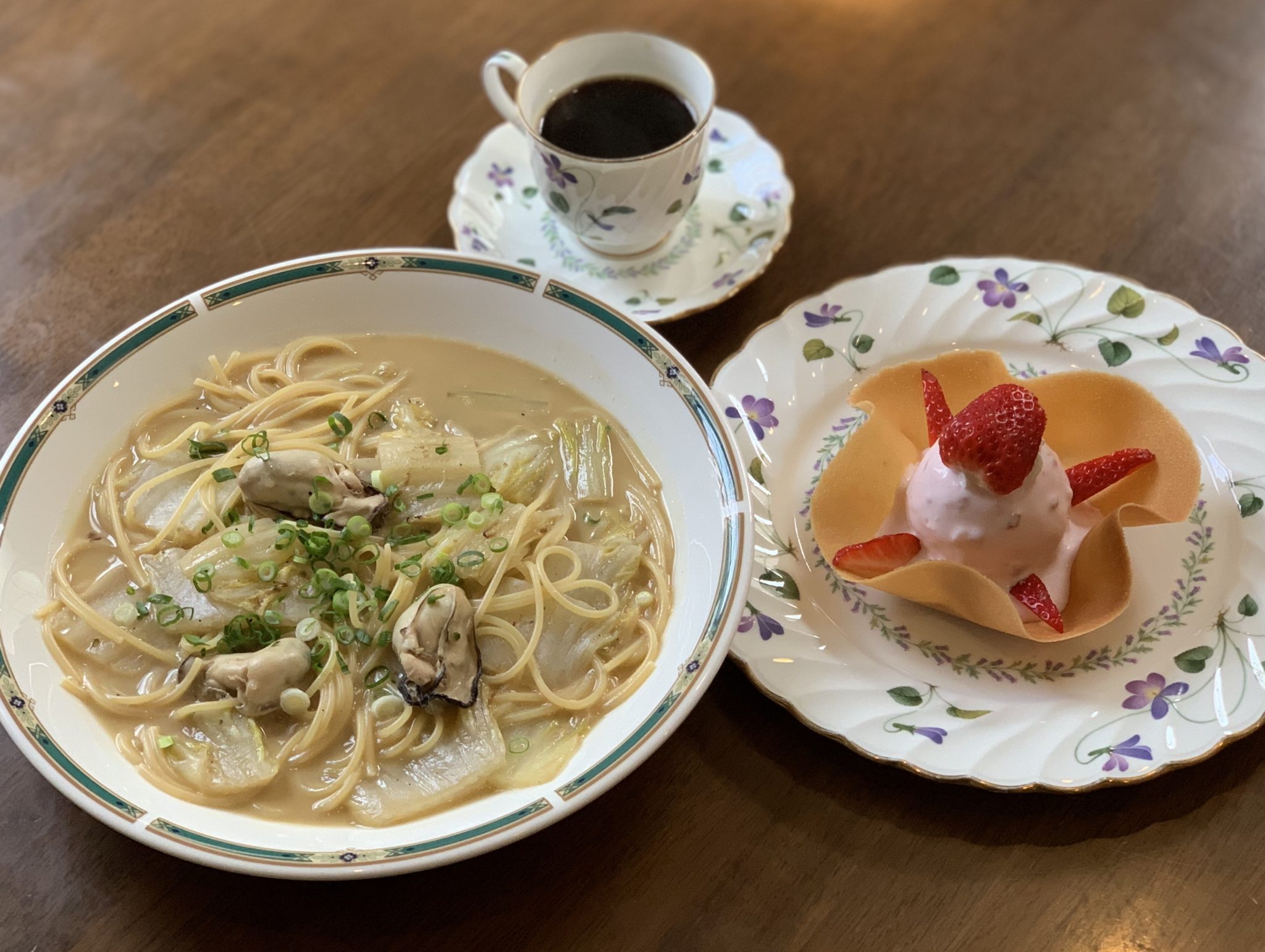 牡蠣と白菜のスパゲッティー、パフェ・オ・クッキー苺のシャンテリーソース、ドリンクを付けて¥1300でご提供します!!※数に限りがございますので品切れの際はご容赦ください。
